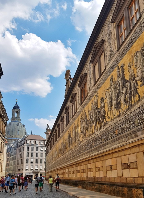 It is by far the most beautiful mural I have seen. Made in honor of the 800th anniversary of the House of Wettin in 1889, it displays the procession of the rulers of Saxony. Keeping its weather-proofing in mind, it was replaced with over 23,000 Meissen porcelain tiles by 1907.
